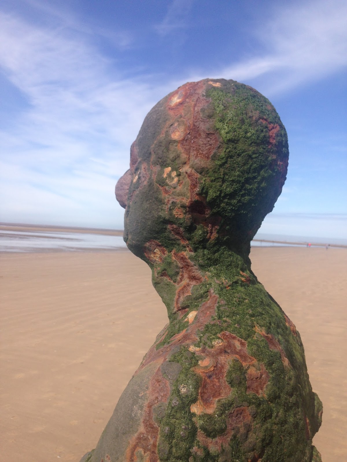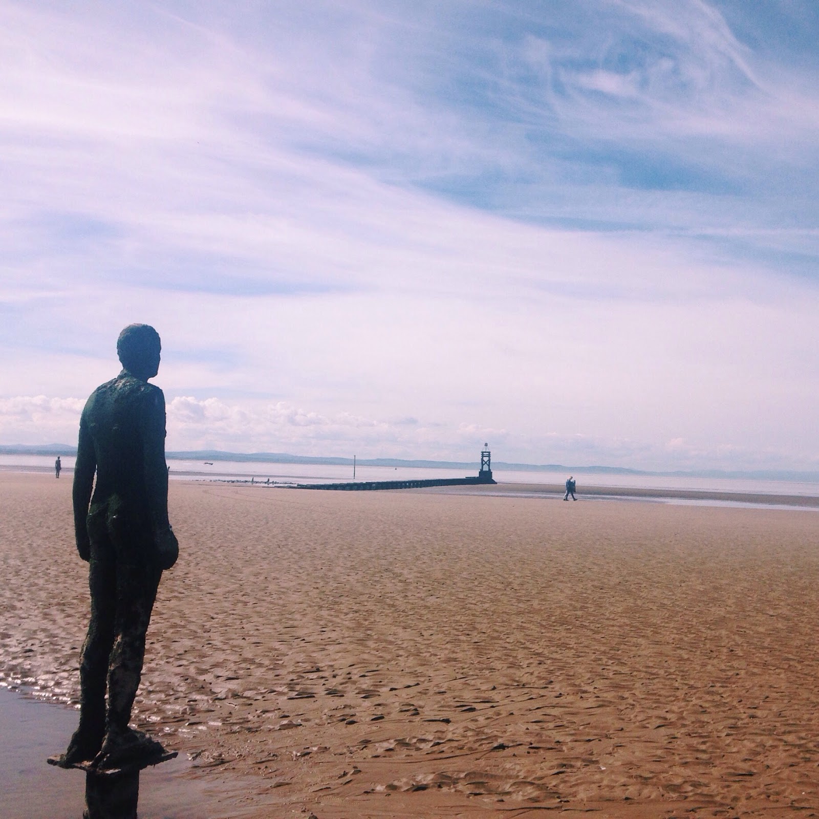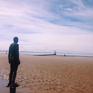 I decided to show off some of the best art we have up here in Merseyside so firstly we headed up to Crosby on the train, we got a day saver ticket for well under £5 and this served us well right through the day. My friend was keen to see the Anthony Gormley installation, Another Place which is 100 identical cast iron statues left along the beach. I've been to the installation more times than I can count but I never tire of it, it's so changeable depending on the weather, tide, time of year and your company. I've been before when the statues were surrounded by thick snow but this time the weather gods blessed us with glorious sunshine (throwing my friend's fears that she would be subjected to eternal greyness for her entire trip out of the window) and we got there when the tide was right out so we got to get up close and personal with the more sea-weathered statues.